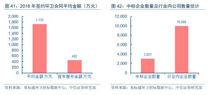 目前國(guó)內(nèi)環(huán)衛(wèi)市場(chǎng)參與企業(yè)數(shù)量多,合同規(guī)模小,環(huán)衛(wèi)市場(chǎng)高度分散。根據(jù)易標(biāo)通環(huán)衛(wèi)招標(biāo)數(shù)據(jù)中心發(fā)布的《2016年全國(guó)環(huán)衛(wèi)服務(wù)環(huán)衛(wèi)招標(biāo)市場(chǎng)年報(bào)》,目前全國(guó)相對(duì)活躍的環(huán)衛(wèi)企業(yè)約有10,000家左右。2016年,全國(guó)共有3,234家企業(yè)中標(biāo)環(huán)衛(wèi)項(xiàng)目,全國(guó)各地共發(fā)布環(huán)衛(wèi)招標(biāo)項(xiàng)目5,497個(gè),按照中標(biāo)企業(yè)數(shù)量計(jì)算,平均每家企業(yè)中標(biāo)項(xiàng)目數(shù)量為1.7個(gè)。此外,從合同規(guī)??矗?016年,全國(guó)各地新簽環(huán)衛(wèi)服務(wù)合同總金額為861億元,平均每個(gè)項(xiàng)目的合同金額為1,733萬(wàn)元;新簽項(xiàng)目的首年服務(wù)總金額為224億元,平均每個(gè)項(xiàng)目的首年服務(wù)金額為452萬(wàn)元,項(xiàng)目規(guī)模明顯偏小。