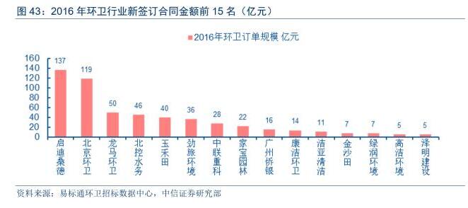 盡管參與企業(yè)眾多,但隨著資本快速進(jìn)入,龍頭企業(yè)開始快速跑馬圈地,環(huán)衛(wèi)市場(chǎng)訂單逐步在向具有資金&資源&管理的優(yōu)勢(shì)企業(yè)集中。根據(jù)易標(biāo)通環(huán)衛(wèi)招標(biāo)數(shù)據(jù)中心統(tǒng)計(jì)數(shù)據(jù),按照合同規(guī)模排名,2016年國(guó)內(nèi)環(huán)衛(wèi)市場(chǎng)簽約規(guī)模前5名企業(yè)為啟迪桑德、北京環(huán)衛(wèi)、龍馬環(huán)衛(wèi)、北控水務(wù)、玉禾田等,簽約合同規(guī)模分別為137、119、50、46、40億元。2016年前15名企業(yè)的合同簽約規(guī)模合計(jì)為542億元,占全國(guó)新簽環(huán)衛(wèi)服務(wù)合同總規(guī)模的62.9%。