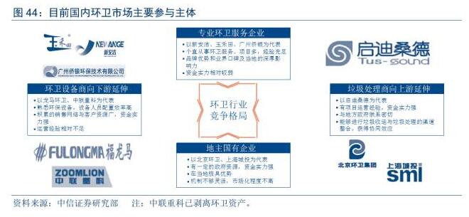 延伸業(yè)務(wù)鏈條進(jìn)入環(huán)衛(wèi)的上市公司:在品牌影響力和融資實(shí)力突出,全國(guó)性布局環(huán)衛(wèi)市場(chǎng),上下游資源整合能力突出。啟迪桑德、中國(guó)天楹等固廢處理公司通過業(yè)務(wù)從廢物末端處置向前端收運(yùn)延伸而切入環(huán)衛(wèi)市場(chǎng),而龍馬環(huán)衛(wèi)、中聯(lián)重科(目前環(huán)衛(wèi)資產(chǎn)已剝離)等公司通過上游環(huán)衛(wèi)設(shè)備銷售為入口向下游環(huán)衛(wèi)運(yùn)營(yíng)業(yè)務(wù)延伸;對(duì)于北控水務(wù)(H)等有志于打造環(huán)境綜合服務(wù)商的企業(yè)而言,目前也在積極布局環(huán)衛(wèi)市場(chǎng)。