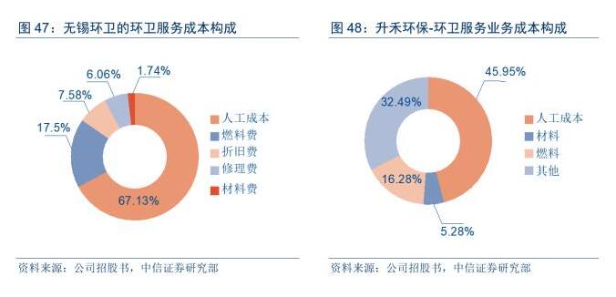 從成本構(gòu)成看,環(huán)衛(wèi)服務(wù)項(xiàng)目成本主要由環(huán)衛(wèi)職工薪酬、保險(xiǎn)等人工成本、環(huán)衛(wèi)車輛等環(huán)衛(wèi)設(shè)備燃料成本、設(shè)備折舊、設(shè)備維修費(fèi)等部分組成,勞動(dòng)力高度密集導(dǎo)致人工成本占比最大,目前普遍占到環(huán)衛(wèi)運(yùn)營(yíng)成本的60%~70%。