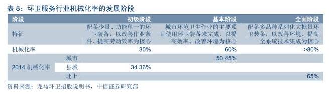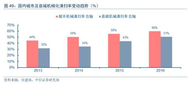 從國(guó)內(nèi)機(jī)械化率變動(dòng)趨勢(shì)看,近年來持續(xù)處于快速提升趨勢(shì)中,其中城市機(jī)械化清掃率從2013年的44%提升至2016年的60%,縣城機(jī)械化清掃率從2013年的32%提升至2016年的51%,2013~2016年平均分別提升5個(gè)及6個(gè)百分點(diǎn)。參考海外環(huán)衛(wèi)全部機(jī)械化作業(yè)的發(fā)展經(jīng)驗(yàn),國(guó)內(nèi)機(jī)械化率提升仍有較大提升空間。
