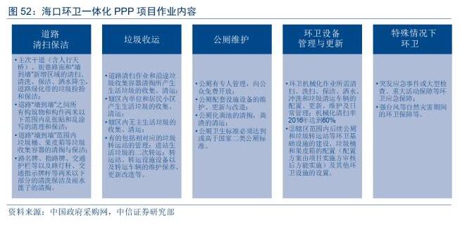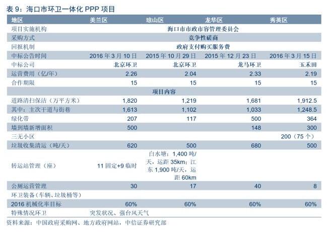 在國(guó)家及地方一系列環(huán)衛(wèi)市場(chǎng)化政策推動(dòng)下,環(huán)衛(wèi)服務(wù)業(yè)市場(chǎng)化項(xiàng)目規(guī)模迅速擴(kuò)大。目前已有許多以PPP模式運(yùn)營(yíng)的環(huán)衛(wèi)項(xiàng)目完成招標(biāo)。在招標(biāo)時(shí),一種模式為環(huán)衛(wèi)一體化的整體處理項(xiàng)目,包含道路清掃、垃圾清運(yùn)、公廁維護(hù)等分項(xiàng)的項(xiàng)目;除上述模式外,將環(huán)衛(wèi)與后端垃圾焚燒發(fā)電、餐廚及污泥處置等項(xiàng)目綜合打包也開始變得頻繁起來。其中??诃h(huán)衛(wèi)一體化PPP項(xiàng)目以及固原市循環(huán)經(jīng)濟(jì)產(chǎn)業(yè)園及環(huán)衛(wèi)一體化項(xiàng)目分別為上述模式的典型案例。