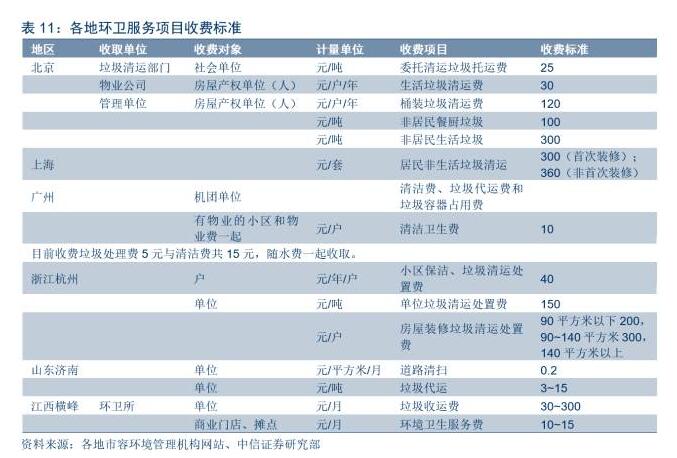 而對(duì)于垃圾清運(yùn)項(xiàng)目,部分地區(qū)沒有對(duì)此項(xiàng)進(jìn)行相關(guān)收費(fèi)規(guī)定,而僅針對(duì)從市政垃圾轉(zhuǎn)運(yùn)站到后續(xù)處理的過程收取垃圾處理費(fèi)。根據(jù)收費(fèi)對(duì)象不同以及是否為生活垃圾,收費(fèi)標(biāo)準(zhǔn)也有所不同。以北京市為例,其收取生活垃圾清運(yùn)費(fèi)標(biāo)準(zhǔn)為30元/戶/年,遠(yuǎn)遠(yuǎn)低于垃圾清運(yùn)75元/噸的市場(chǎng)價(jià)格,多余部分主要靠財(cái)政補(bǔ)貼為主;而且垃圾清運(yùn)費(fèi)的收取存在難度,廣州因?yàn)槎鄳羟防U費(fèi)用,考慮試行隨水費(fèi)一起征收的辦法來提高繳費(fèi)居民比例,差額部分仍需政府財(cái)政投入來保證環(huán)衛(wèi)服務(wù)項(xiàng)目正常運(yùn)轉(zhuǎn)。