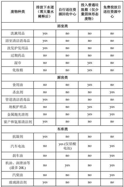 家庭危險廢物包括漂白劑、花園和泳池用化學(xué)品、油漆、溶劑等。居民可打電話給市政部門上門收集,或包裝好送往資源處理中心,但處理都會收費。每年每個區(qū)域(類似我們的街道)都會有兩三次免費日,在這幾天送危險廢物將不收費。由于危險廢物種類繁多,為了便于居民區(qū)分這類廢物與其它廢物,市議會有詳細(xì)的垃圾投放指導(dǎo),如表2所示。