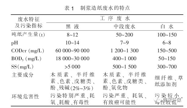 造紙廢水產(chǎn)生與生產(chǎn)過程的各個(gè)工序有關(guān),總的來(lái)說(shuō)可以分為黑液、中段廢水與白水三類,其成分、產(chǎn)生量及水質(zhì)特征列于表1