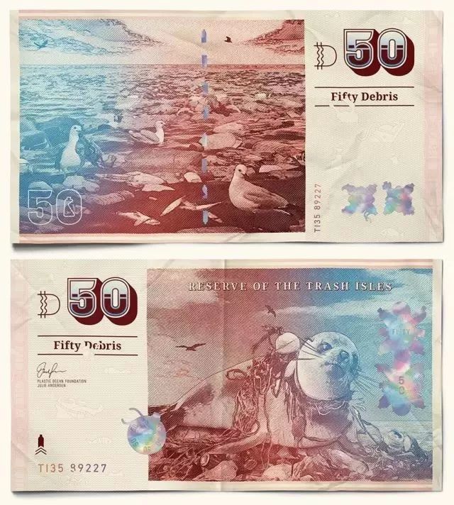 其他國家的貨幣都是領(lǐng)導(dǎo)人或風(fēng)景名勝,垃圾群島共和國的貨幣則獨樹一幟,均是動物遭受海洋垃圾迫害的慘烈場景。