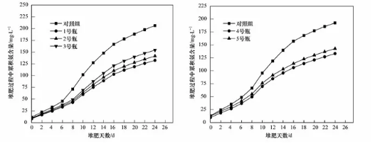 由圖3可知,前6d兩周期的揮發(fā)氨累積量沒有明顯的變化,但均呈現(xiàn)上升的趨勢,堆肥進行第8d到第18d是氨氮損失量最大的區(qū)段,之后由于溫度降低,有機物的消耗以及微生物的活動減弱,氨氮損失量變小,慢慢趨向穩(wěn)定。未投加中藥渣時,對照組堆體的氨氮揮發(fā)累積量達到了206.5mg˙L-1,而1號瓶(60g中藥渣+300g污泥)堆體的氨氮揮發(fā)累積量僅為132.2mg˙L-1,與對照組相比減少了35.9%,原因在于微生物的固氮是需要碳源的,但城市污泥中的C/N往往不足,因此微生物的固氮能力差,導(dǎo)致了氮的損失嚴(yán)重;而中藥渣富含碳源,可以調(diào)整堆體的C/N,從而使微生物能更好的發(fā)揮其固氮作用。