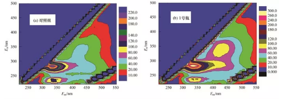 為了更全面地分析DOM,本實驗采用熒光分析儀對對照組與1號瓶堆體第10d的DOM三維熒光光譜特征進行了分析,如圖6所示。在不同堆體中均出現(xiàn)了可見光區(qū)類腐殖酸峰A(Ex/Em=310~360nm/400~450nm),紫外光區(qū)類腐殖酸峰B(Ex/Em=250~280nm/420~450nm),類蛋白熒光峰C(Ex/Em=250~280nm/320~380nm)及簡單芳香蛋白熒光峰D(Ex/Em=220~250nm/300~380nm),添加中藥渣的堆體,其類腐殖酸峰更強,表明堆肥腐殖化程度更好,添加外源有機質(zhì)有利于提高堆肥的腐殖化程度。有研究認(rèn)為BIX在0.6~0.7之間時,DOM主要為陸源輸入,外源輸入特征明顯,而本研究中BIX分別為0.73和0.80,證明了堆肥過程中DOM主要來源為自生源。FI是評價DOM來源的依據(jù):FI<1.4來源于陸地輸入,F(xiàn)I>1.4時來自于微生物分解,對照組和處理組FI為1.57和1.53,表明微生物對有機物的降解也是堆肥形成的主要原因。