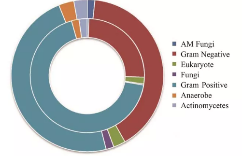 由圖7可知,在對照組與1號瓶中,均是細(xì)菌占主要地位,GramPositive(革蘭氏陽性菌)所占比例分別為67.9%和47.9%,而GramNegative(革蘭氏陰性菌)所占比例分別為24.9%和40.2%。投加中藥渣后,AMFungi(AM真菌)的比例由原來的0.49%增加到1.58%,F(xiàn)ungi(真菌)的比例由原來的0.31%增加到1.68%,由于真菌對堆體中的纖維素、半纖維素有著很好的降解作用,其菌絲具有機械穿插的作用,從而可促進難降解的有機物的降解;同時Actinomycetes(放線菌)的比例由原來的2.30%增加到2.86%,放線性菌對木質(zhì)素的降解有著非常好的作用,可見,加入中藥渣對污泥堆肥結(jié)束時,堆體中的微生物種群變化有較大影響,從而也影響了蛋白酶活性及氨揮發(fā)情況。