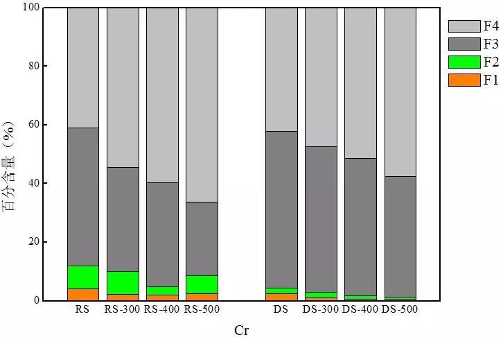 對比兩種熱解炭中Cr的分布可以發(fā)現(xiàn),消化污泥熱解炭中穩(wěn)定態(tài)Cr含量均高于同等溫度下生污泥熱解炭,尤其是F3態(tài)Cr的含量。以300 ℃熱解炭為例,RS-300和DS-300中F3態(tài)Cr的含量分別為35.4%和49.7%。這可能是因為生污泥中含有大量的含硫化合物(S含量達(dá)到1.97%),在厭氧環(huán)境下Cd更易形成硫化物,使消化污泥中F3態(tài)含量高于生污泥,從35.5%增加到53.5%,進(jìn)而導(dǎo)致消化污泥熱解炭中F3態(tài)Cr含量高于生污泥熱解炭。