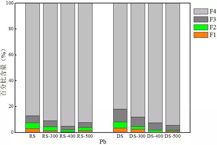 經(jīng)過熱解作用,Pb在兩種熱解炭中F1態(tài)含量降低,而在F4態(tài)中的分布增加。在400 ℃熱解條件下兩種熱解炭中穩(wěn)定態(tài)金屬含量均達(dá)到最大,分別為97.9%和98.0%,熱解溫度繼續(xù)升高時,污泥熱解炭中殘渣態(tài)含量開始降低,而消化污泥熱解炭中殘渣態(tài)金屬含量保持增加趨勢??梢园l(fā)現(xiàn)同等溫度下消化污泥熱解炭中F3態(tài)Pb略高于生污泥熱解炭,但兩種熱解炭中非穩(wěn)態(tài)含量基本相同,這也進(jìn)一步證明Pb是污泥中最穩(wěn)定的金屬,經(jīng)過厭氧消化后,污泥中Pb形態(tài)分布變化幅度較小,因此兩種熱解炭中Pb的分布也較為相似。