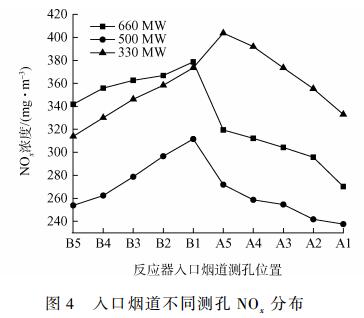 2)在660、500、330MW負(fù)荷下,反應(yīng)器入口煙道NOx均值偏差分別為13.4%、17.1%、18.1%,而速度均值偏差分別為6.1%、6.4%、6.6%。不同測(cè)孔位置濃度場(chǎng)分布差異性較大,是噴氨格柵優(yōu)化調(diào)整的一個(gè)不可忽視的重要因素,而反應(yīng)器入口速度場(chǎng)分布相對(duì)均勻,對(duì)噴氨格柵優(yōu)化調(diào)整影響較小。