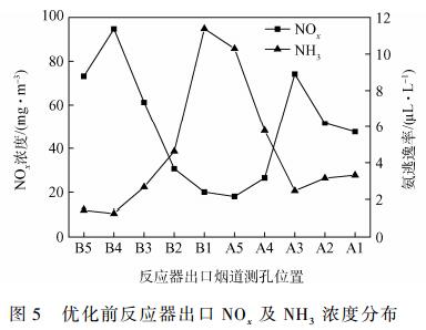 從圖5可以看出,根據(jù)出口NOx濃度和氨逃逸濃度的對(duì)應(yīng)關(guān)系,NOx濃度較低的區(qū)域?qū)?yīng)較大的噴氨量,極易產(chǎn)生較大氨逃逸濃度。B1、A5等2個(gè)測(cè)孔位置出口NOx濃度均小于20mg?m-3,其代價(jià)是很大的噴氨量和較高的氨逃逸。