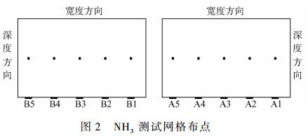 通過(guò)網(wǎng)格布點(diǎn)測(cè)量SCR裝置的入口及出口煙道,煙道共布置10個(gè)測(cè)孔,編號(hào)依次為B5→B1、A5→A1,其中NO、O2取樣點(diǎn)共選取2×5×5個(gè)(取深度方向5點(diǎn)均值),NH3取樣點(diǎn)共選取2×5×1個(gè),具體布置如圖1所示。NO、O2經(jīng)Testo350煙氣分析儀直接測(cè)定,氨逃逸樣品采用美國(guó)EPA的CTM-027標(biāo)準(zhǔn)以化學(xué)溶液法采集,取樣時(shí)間20min。通過(guò)分析樣品溶液中的氨濃度(見(jiàn)圖2),并根據(jù)所采集的干態(tài)煙氣流量和O2,計(jì)算各點(diǎn)干基煙氣NH3濃度。