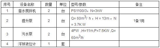設(shè)計調(diào)節(jié)池1座,水力停留時間22h ,尺寸為25m×10m×6.0m ,有效水深5.5m ,鋼混結(jié)構(gòu)。池內(nèi)主要設(shè)備如下表。