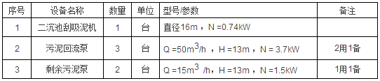 中心進水的輻流式沉淀池一座,二沉池直徑16m ,總高4.4m ,超高0.5m ,鋼筋混凝土結(jié)構(gòu)。內(nèi)設(shè)刮吸泥機1臺,功率1.87kW 。二沉池的底泥通過刮吸泥機進入集泥井,集泥井尺寸為4.5m×3.0m×5.9m。主要設(shè)備如下表。