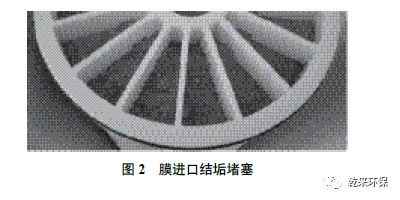 為減少蒸發(fā)量,部分廠家采用RO 膜技術(shù)進(jìn)行濃縮。煤化工廢水TDS濃度約為3 000 mg ˙ L-1,硬度約為300 mg ˙ L-1,COD 約為300 mg ˙L-1。在高濃縮比的工況下,長時(shí)間運(yùn)行會對膜進(jìn)口和膜面產(chǎn)生污染。因此需投加藥劑除硬,增加了污泥外置費(fèi)用。卷式RO 膜無法進(jìn)一步提高濃縮比的主要原因有兩個(gè):第一是卷式RO 膜的進(jìn)入通道較窄,第二是其膜面剪切力不足。RO 膜進(jìn)口結(jié)垢堵塞情況見圖2。