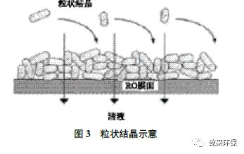 3.2膜面結(jié)晶:膜面結(jié)晶是RO 膜應(yīng)用的重要議題。按結(jié)晶理論,結(jié)晶狀態(tài)通??煞譃榱罱Y(jié)晶和膜面結(jié)晶。當(dāng)溶液達(dá)到溶解度極限范圍時(shí),分子相互碰撞產(chǎn)生晶體,晶體是不溶解的粒狀固體,隨水流方向壓到膜面上。粒狀晶體堆在膜面上比較松散,或隨著水流沖到濃液出口,因此粒狀結(jié)晶不會對膜通量帶來太大影響。粒狀結(jié)晶見圖3。