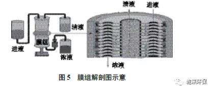 震動(dòng)膜的工作原理就是針對膜濃縮的兩個(gè)難點(diǎn)來設(shè)計(jì)的。震動(dòng)膜主要由兩個(gè)部分組成,膜組和使膜組產(chǎn)生往復(fù)運(yùn)動(dòng)的振動(dòng)機(jī)械。膜組里是圓形的平板膜,膜片可按需求使用不同精度的膜材。膜片與膜片的間隙為3 mm,進(jìn)口通道比較寬,有效避免了在進(jìn)口位置產(chǎn)生結(jié)垢。進(jìn)液在壓力作用下從進(jìn)口流到濃液口。在進(jìn)料泵壓力下,清液通過膜片,鹽份被截留。膜組剖面示意見圖5。