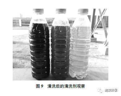 圖8 中A、B 膜片在清洗前發(fā)現(xiàn)有大量膠狀有機(jī)物,通過化學(xué)清洗后可以恢復(fù)潔白(如圖8C 所示),清洗出來的殘余物D 為塊狀物質(zhì)。因而化學(xué)清洗可以令膜再生。但實(shí)際上該膜組的清洗程度并不夠。通過對該項(xiàng)目正運(yùn)行的膜組連續(xù)進(jìn)行三次化學(xué)清洗,每次對清洗浸泡液取樣觀察(見圖9)。