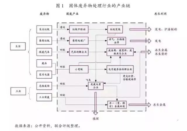 固體廢棄物主要來自于居民生活和工業(yè)生產(chǎn),數(shù)量巨大,品種繁多,要求相應的處理手段嚴格,可重復利用程度較高。固體廢棄物通過填埋、焚燒、堆肥、回收利用或者循環(huán)再生方式進行無害化處理。固體廢棄物處理行業(yè)的產(chǎn)業(yè)鏈如下圖所示。