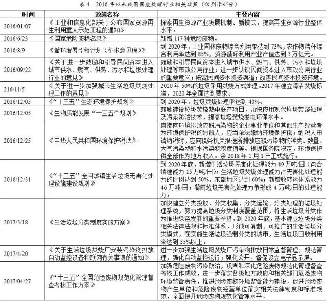 《“十三五”全國城鎮(zhèn)生活垃圾無害化處理設施建設規(guī)劃》助推垃圾焚燒發(fā)電行業(yè)快速發(fā)展;最新頒布的《國家危險廢物名錄》對于危廢的識別更加清晰,危廢處理更加有據(jù)可循;《環(huán)境保護稅法》于2018年1日1日正式施行,“排污費改稅”有利于引導排污單位減少污染物排放;《納入排污許可管理的火電等17個行業(yè)污染物排放量計算方法(試行)》和《未納入排污許可管理行業(yè)適用的排污系數(shù)、物料衡算方法(試行)》是全面細化和保障環(huán)保稅法實施的綜合性配套法規(guī),進一步明確環(huán)保稅稅制要素。