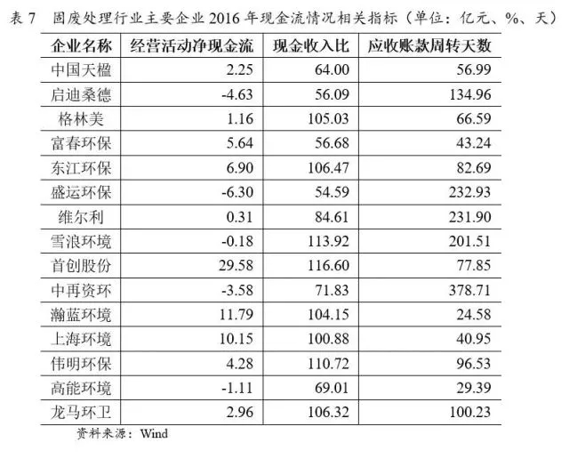 從經(jīng)營效率指標來看,固廢處理行業(yè)的應收賬款普遍很高,由于預算內(nèi)撥款被占用,導致賬面掛賬,政府實際給付時間延后。2016年樣本企業(yè)應收賬款周轉(zhuǎn)天數(shù)的中位數(shù)82.69天,行業(yè)欠款周期普遍在2~3個月,部分固廢處理企業(yè)存在其他公用事業(yè)的業(yè)務,回款周期較短,沖抵了部分固廢處理的回款期限。