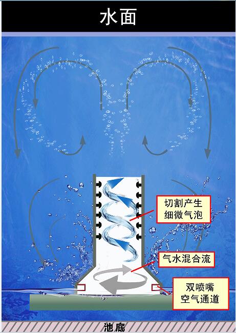 旋流曝氣器在工作過(guò)程中,氣體從底部法蘭口進(jìn)入后從緊貼鐘型曲面的 2 個(gè)噴嘴噴出形成旋流效果,以極快的速度沿著鐘型壁面向上加速回旋。由于鐘型上側(cè)漸漸狹窄,空氣獲得極大的加速度和沖擊力。 由于氣體作用,混合液在筒內(nèi)、外循環(huán)流動(dòng),氣液上升過(guò)程中,被筒內(nèi)部結(jié)構(gòu)多次碰撞切割,形成大量超微氣泡,且與周圍的泥水混合物充分混合,增加了氧氣的傳質(zhì)速率和氧利用率;充分混合的氣水猛力向上沖出,強(qiáng)烈的循環(huán)水流使部分小氣泡和水流返回池底,同時(shí)使底部淤泥參與循環(huán),因而整個(gè)曝氣池內(nèi)無(wú)充氧盲區(qū),實(shí)現(xiàn)了曝氣池容積利用最大化。(見圖3)