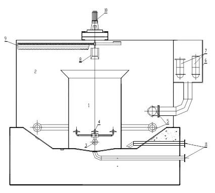 7—出水裝置;8—排渣槽;9—刮泥機;10—電機及減速機; 11—接觸室、分離室排污管