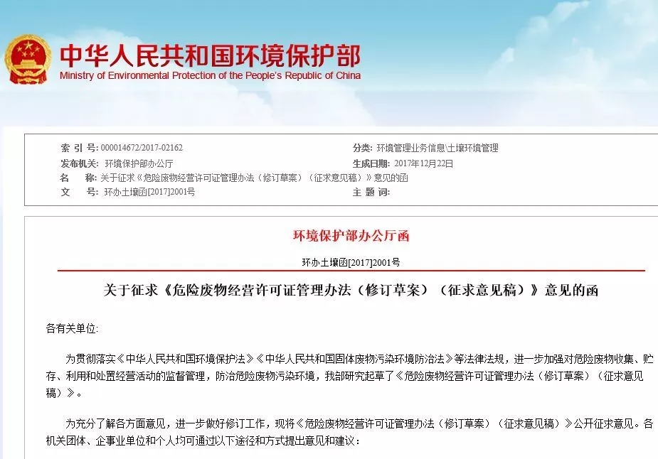 環(huán)境保護部公布的“關(guān)于征求《危險廢物經(jīng)營許可證管理辦法(修訂草案)(征求意見稿)》意見的函(環(huán)辦土壤函[2017]2001號),其中,第三十九條 以下危險廢物利用或者處置活動免于領(lǐng)取危險廢物經(jīng)營許可證: