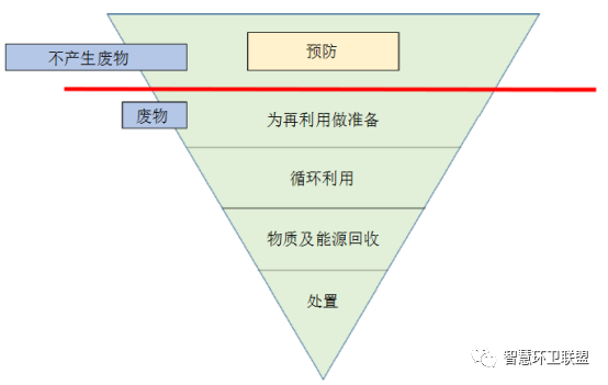 金字塔中的預(yù)防指:在設(shè)計(jì)和制造產(chǎn)品的過程中,盡量減少原料的使用量;延長(zhǎng)產(chǎn)品的使用壽命;減少有害物質(zhì)的使用量。為再利用做準(zhǔn)備指:對(duì)產(chǎn)品的整體或部件進(jìn)行檢查、清理、修理、翻新等工作。循環(huán)利用指:使用廢物生產(chǎn)新的物質(zhì)或產(chǎn)品,包括堆肥。其他回收手段指:使用厭氧消化、焚燒發(fā)電、氣化等手段產(chǎn)生能量(包括燃料、熱、電)和一些物料(可以用作回填物)。處置指:填埋和沒有能量回收手段的焚燒。