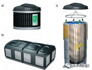 為了進(jìn)行廢物的投放,產(chǎn)業(yè)所有者或物業(yè)管理公司應(yīng)當(dāng)為住宅提供生活垃圾的投放點(diǎn)。投放時(shí)采用的容器分為普通容器(更為常用)和埋入式容器(正在普及)兩種。常用的普通投放容器分別為140升(圖8中c)、240升(圖8中b)、600升(圖8中a)這三種。普通投放容器的缺點(diǎn)是,雖然容積不大,但卻會(huì)占據(jù)將對(duì)較大的空間。埋入式容器部分設(shè)置于地下,內(nèi)部配備高強(qiáng)度織物容納袋,容納能力遠(yuǎn)高于普通容器,能夠在節(jié)省空間的同時(shí),起到降低收運(yùn)頻次的作用。收運(yùn)時(shí),收運(yùn)車輛會(huì)將織物袋從容器中取出,通過打開袋底的機(jī)關(guān)清空廢物。