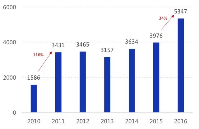 資質(zhì)企業(yè)平均規(guī)模較小:2016年我國持危險廢棄物經(jīng)營許可證的企業(yè)數(shù)量為2149家,2016年凈增加僅115家,體現(xiàn)出環(huán)保系統(tǒng)對新頒發(fā)許可證愈發(fā)謹(jǐn)慎;平均每家處理量僅不到3萬噸,呈現(xiàn)較強的分散性特征,但單企業(yè)處理規(guī)模由2014年2.2萬噸/年增加到2016年3.0萬噸/年,未來隨著許可證頒發(fā)與復(fù)核難度加大,實力弱、技術(shù)差的小企業(yè)將被淘汰出市場,龍頭擴張,單企業(yè)規(guī)模繼續(xù)擴大。
