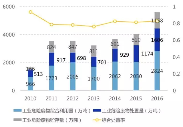 在環(huán)保監(jiān)管力度增強,各省均推出省級督查方案背景下,危廢處置剛需再次提升,尤其是要求進入規(guī)范渠道處置的量增加。但市場情況是,實際產(chǎn)生量遠(yuǎn)大于統(tǒng)計量(披露16年5347萬噸,預(yù)計實際8000萬噸),低綜合利用處置率(83%),低有效利用率(25%),導(dǎo)致整體危廢的處置供不應(yīng)求。
