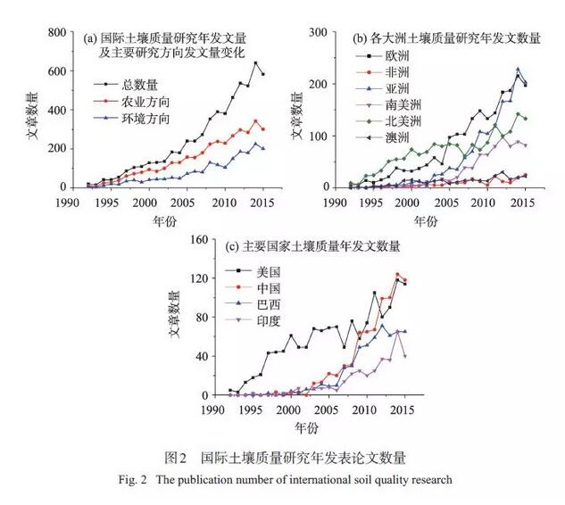 國(guó)際土壤質(zhì)量研究熱點(diǎn)從有機(jī)質(zhì)及其組分對(duì)管理措施的響應(yīng)、微生物指標(biāo)的敏感性、土壤質(zhì)量的定義到土壤質(zhì)量評(píng)價(jià)方法、評(píng)價(jià)指標(biāo)和框架的完善,從理論轉(zhuǎn)向?qū)嵺`,將土壤質(zhì)量應(yīng)用于農(nóng)業(yè)生產(chǎn)和環(huán)境保護(hù)中。近年來(lái),土壤質(zhì)量的監(jiān)測(cè)及其對(duì)土壤修復(fù)、全球氣候變化的響應(yīng)引發(fā)大量學(xué)者關(guān)注。在發(fā)展過(guò)程中,土壤質(zhì)量由農(nóng)業(yè)開(kāi)始向環(huán)境方向滲透。