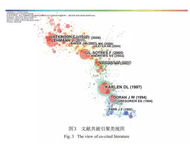 以1 a 為時(shí)間切片,節(jié)點(diǎn)類型為參考文獻(xiàn),選取Top 50 (被引量前50 篇文章) 繪制文獻(xiàn)共被引圖譜。引文年輪代表著某篇文章的引文歷史,年輪顏色代表相應(yīng)的引文時(shí)間,年輪厚度與相應(yīng)時(shí)間分區(qū)內(nèi)的引文數(shù)量成正比。中心度較高的文獻(xiàn)可能成為網(wǎng)絡(luò)中由一個(gè)時(shí)間段向另一個(gè)時(shí)間段過(guò)渡的關(guān)鍵點(diǎn),具有一定程度的理論創(chuàng)新。突現(xiàn)性較高的文獻(xiàn)是指在某一階段被引次數(shù)迅速上升的文獻(xiàn),這類文獻(xiàn)可能會(huì)成為后來(lái)的中心文獻(xiàn)和研究熱點(diǎn)。本研究共探測(cè)出中心性在0.01 以上的文獻(xiàn)共204 篇,為突出關(guān)鍵文獻(xiàn),截取中心性在0.03 以上的關(guān)鍵文獻(xiàn)共44 篇。所選取的這44 篇高中心性文獻(xiàn)的被引頻次和突現(xiàn)性均較大,它們是土壤質(zhì)量研究文獻(xiàn)群中起到關(guān)鍵作用或具有轉(zhuǎn)折意義的文獻(xiàn),是不同時(shí)期的基礎(chǔ)性、奠基性經(jīng)典文獻(xiàn),對(duì)該領(lǐng)域?qū)W術(shù)發(fā)展發(fā)揮著重要作用。圖3 中,共被引頻次較高、中心度較大的節(jié)點(diǎn)年輪較大,是引發(fā)大量學(xué)者關(guān)注或發(fā)生研究轉(zhuǎn)向的文獻(xiàn)(為避免文獻(xiàn)較多而造成的文字疊加,本圖僅列出共被引量大于17 的文獻(xiàn))。圖中紅色年輪代表突現(xiàn)性較大的關(guān)鍵文獻(xiàn),由藍(lán)色區(qū)域到紅色區(qū)域分別代表了1992—2016 年的研究時(shí)段。