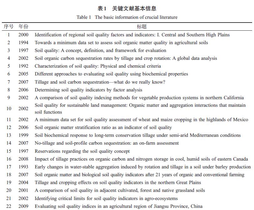 進(jìn)入20 世紀(jì)90 年代以來(lái),國(guó)際上關(guān)于土壤質(zhì)量研究的文獻(xiàn)大量涌現(xiàn),涉及的學(xué)科和內(nèi)容非常廣泛。目前針對(duì)土壤質(zhì)量相關(guān)文獻(xiàn)的綜述已有不少,其中國(guó)外學(xué)者就土壤質(zhì)量概念與應(yīng)用、評(píng)價(jià)指標(biāo)、耕作、種植制度、作物殘茬管理對(duì)土壤質(zhì)量的影響等方面展開(kāi)評(píng)述;國(guó)內(nèi)對(duì)土壤質(zhì)量研究綜述多集中在土壤質(zhì)量評(píng)價(jià)方法、指標(biāo)、標(biāo)準(zhǔn)以及可持續(xù)土地管理方面。這些研究綜述的發(fā)表對(duì)國(guó)內(nèi)外學(xué)者了解以及推動(dòng)土壤質(zhì)量研究發(fā)揮了重要作用。但是面對(duì)成千上萬(wàn)的龐大文獻(xiàn)群,以文獻(xiàn)閱讀、總結(jié)歸納、定性探討為主要方法的傳統(tǒng)文獻(xiàn)綜述存在明顯的局限性,如Karlen 等、Sparrow 等、Sithole 等僅就土壤質(zhì)量的某個(gè)方面進(jìn)行了文獻(xiàn)綜述,其參考價(jià)值的高低也取決于研究者本身的研究水平,無(wú)法客觀、全面地反映該領(lǐng)域的發(fā)展脈絡(luò)以及研究趨勢(shì)。因此,還需要采用更為科學(xué)的方法對(duì)以上問(wèn)題做進(jìn)一步的分析和探討。