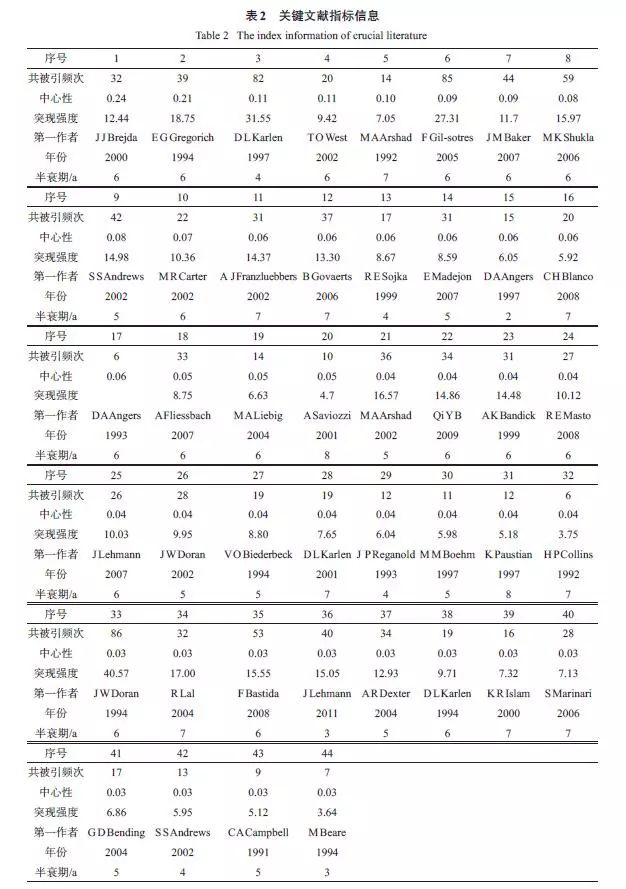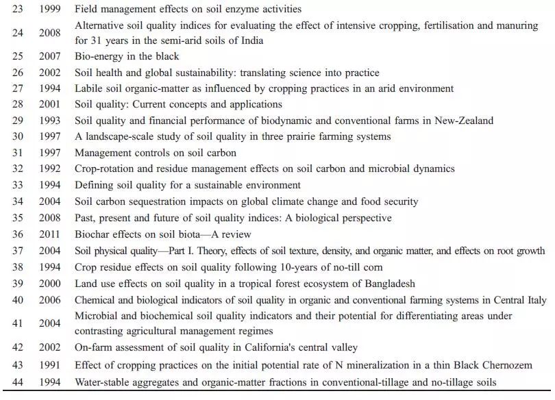 經(jīng)典文獻(xiàn)都密切關(guān)注了文獻(xiàn)發(fā)表時(shí)期該領(lǐng)域發(fā)展的熱點(diǎn)問(wèn)題,因其較高的社會(huì)關(guān)注度、創(chuàng)新性和系統(tǒng)性,從而引發(fā)其他學(xué)者大量引用。通過(guò)對(duì)44 篇經(jīng)典文獻(xiàn)內(nèi)容的分析,2000 年以前多關(guān)注農(nóng)業(yè)管理措施對(duì)有機(jī)質(zhì)的影響和土壤質(zhì)量的概念,2000 年以后,對(duì)土壤質(zhì)量評(píng)價(jià)方法、評(píng)價(jià)指標(biāo)尤其是生物學(xué)指標(biāo)的研究不斷興起,更多地注重土壤質(zhì)量在農(nóng)業(yè)和環(huán)境方面的應(yīng)用,2008 年以來(lái),關(guān)于土壤質(zhì)量與全球氣候變化、土壤修復(fù)的關(guān)系研究受到更多學(xué)者關(guān)注。從整個(gè)過(guò)程來(lái)看,土壤質(zhì)量從概念的產(chǎn)生到廣泛的應(yīng)用,一直圍繞農(nóng)業(yè)與環(huán)境的可持續(xù)發(fā)展,這也是人類可持續(xù)發(fā)展的主題之一。