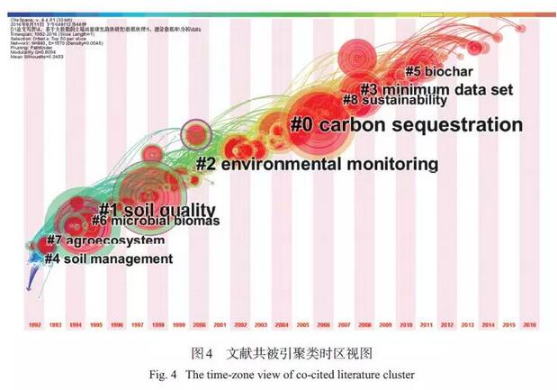 本研究中所認(rèn)為的“研究主題”是指在一定時(shí)段內(nèi),眾多學(xué)者探討和解決的中心問(wèn)題,Citespace V通過(guò)對(duì)文獻(xiàn)共被引的分析,將研究?jī)?nèi)容相似的文獻(xiàn)進(jìn)行歸類并命名。通過(guò)對(duì)5 551 篇文獻(xiàn)進(jìn)行共被引分析,共獲取28 個(gè)聚類,如果聚類中文獻(xiàn)數(shù)量較少,則會(huì)影響其命名的準(zhǔn)確性,因此本研究選取文獻(xiàn)數(shù)量在30 篇以上的8 個(gè)聚類進(jìn)一步分析,聚類的時(shí)間分布和命名見(jiàn)圖 4。通過(guò)圖4 可以發(fā)現(xiàn),研究早期(2000 年以前) 主題較為分散,主要集中在土壤管理(#4)、農(nóng)業(yè)生態(tài)系統(tǒng)(#7)、微生物生物量(#6)、土壤質(zhì)量概念(#1) 等方面,2000 年以來(lái),環(huán)境監(jiān)測(cè)(#2)、碳匯(#0) 研究最多,另外近幾年焦點(diǎn)聚集在可持續(xù)性(#8)、最小數(shù)據(jù)集(#3)、生物炭(#5) 上。