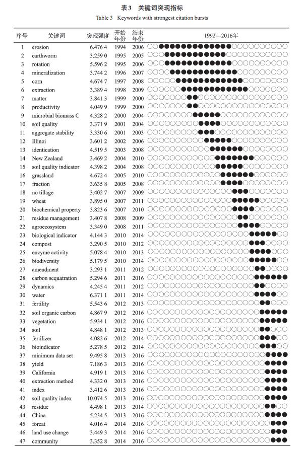 土壤質(zhì)量概念的產(chǎn)生與發(fā)展有著深刻的時(shí)代背景和需求。人類發(fā)展的階段性和動(dòng)態(tài)性、全球氣候變化與人類活動(dòng)影響的加劇、學(xué)科的不斷交融是決定土壤質(zhì)量主題演變的主要因素。土壤質(zhì)量在20 多年的發(fā)展階段中,涌現(xiàn)了一些標(biāo)志性的經(jīng)典文獻(xiàn),引發(fā)了大量學(xué)者關(guān)注,從而產(chǎn)生了新的研究點(diǎn)。依據(jù)Citespace V理論和分析結(jié)果,本文著重對(duì)文獻(xiàn)中心性高于0.03、突現(xiàn)性高于4、共被引頻次大于30 的關(guān)鍵文獻(xiàn)進(jìn)行分析,綜合以上量化指標(biāo),對(duì)該領(lǐng)域研究熱點(diǎn)及其變遷進(jìn)行了解析。在研究趨勢(shì)方面,截取突現(xiàn)性大于4,開(kāi)始年份為2011年,結(jié)束年份為2016年的關(guān)鍵詞進(jìn)行了分析。