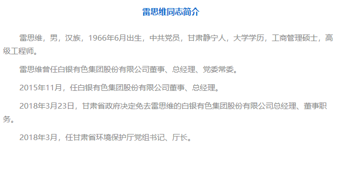 3月28日,甘肅省十三屆人大常委會第二次會議通過了省人民代表大會常務(wù)委員會決定任免名單,決定任命雷思維為甘肅省環(huán)境保護(hù)廳廳長。