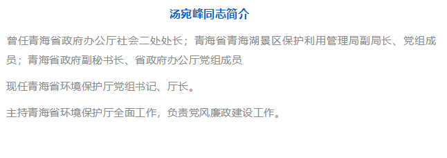 3月30日,青海省第十三屆人民代表大會常務(wù)委員會第二次會議通過,決定任命:湯宛峰為青海省環(huán)境保護(hù)廳廳長。