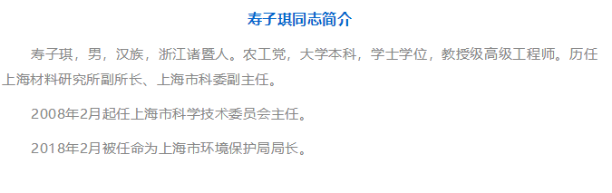 而上海市環(huán)保局局長壽子琪,則是典型的專家型官員,他是教授級高級工程師,歷任上海材料研究所副所長、上海市科學(xué)技術(shù)委員會副主任、上海市科學(xué)技術(shù)委員會主任。
