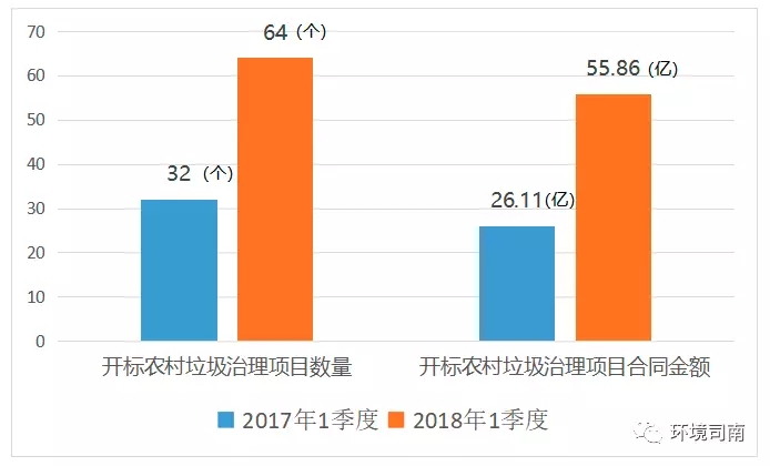 強(qiáng)制垃圾分類試點(diǎn)、農(nóng)村垃圾治理、農(nóng)村人居環(huán)境整治三年行動等相關(guān)政策的陸續(xù)出臺和持續(xù)推進(jìn),農(nóng)村垃圾治理、垃圾分類等非傳統(tǒng)環(huán)衛(wèi)項(xiàng)目不斷涌現(xiàn)。2018年1季度與去年同期相比,垃圾分類和農(nóng)村垃圾治理的項(xiàng)目數(shù)量和中標(biāo)金額均出現(xiàn)倍增。