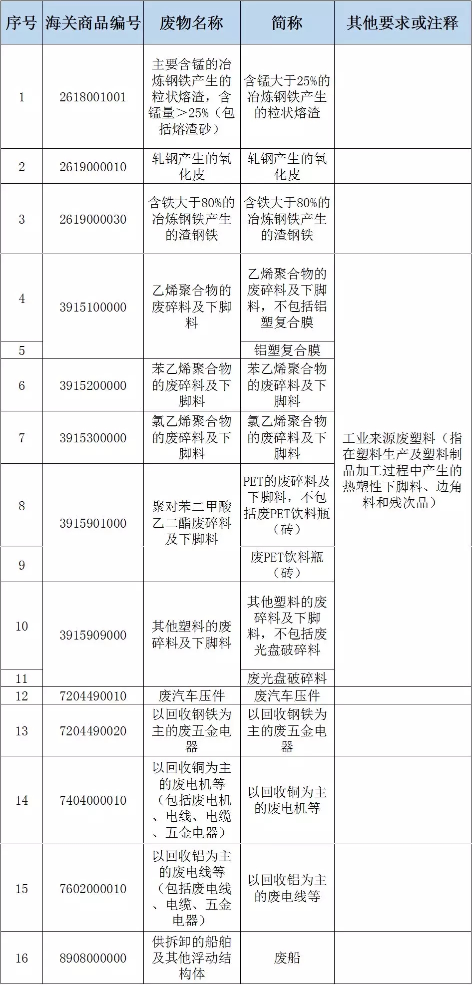 一、將廢五金類、廢船、廢汽車壓件、冶煉渣、工業(yè)來源廢塑料等16個品種固體廢物(見附件1),從《限制進(jìn)口類可用作原料的固體廢物目錄》調(diào)入《禁止進(jìn)口固體廢物目錄》,自2018年12月31日起執(zhí)行。