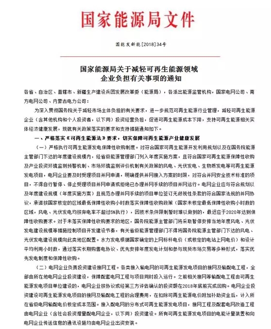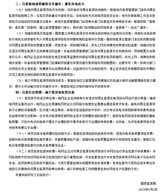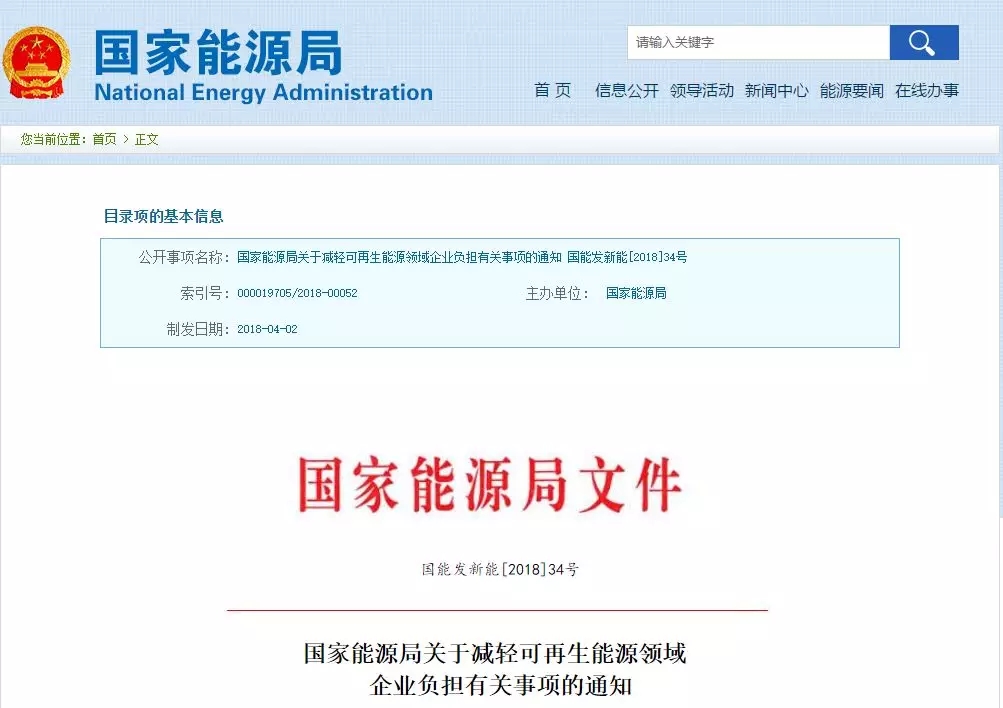2018年4月26日,國(guó)家能源局官網(wǎng)公布《關(guān)于減輕可再生能源領(lǐng)域企業(yè)負(fù)擔(dān)有關(guān)事項(xiàng)的通知》,進(jìn)一步規(guī)范可再生能源行業(yè)管理,減輕可再生能源企業(yè)(含其他機(jī)構(gòu)和個(gè)人投資者)投資經(jīng)營(yíng)負(fù)擔(dān),促進(jìn)可再生能源成本下降。