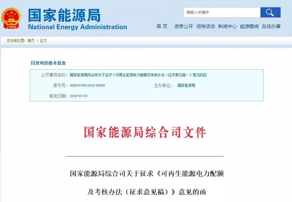 從去年十九大報(bào)告到今年兩會(huì)政府工作報(bào)告,中央多次明確表示要在生態(tài)文明的框架下實(shí)現(xiàn)能源生產(chǎn)和消費(fèi)的革命,到今年兩會(huì)一結(jié)束,國(guó)家能源局立即發(fā)布《可再生能源電力配額及考核辦法征求意見稿》,配額制在醞釀十年之后,總算與市場(chǎng)見面了。