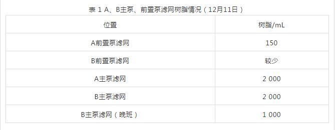 故障三:凝結(jié)水中有樹脂,過熱蒸汽電導(dǎo)率超標(biāo),給水泵主泵、前置泵濾網(wǎng)壓差大,檢查有樹脂。12月11日5:00檢修處理給水泵密封水進(jìn)水濾網(wǎng)時發(fā)現(xiàn)網(wǎng)面內(nèi)有樹脂,樹脂顆粒完整,顆粒偏小。同時,化學(xué)儀表取到水樣后發(fā)現(xiàn)過熱蒸汽電導(dǎo)率高達(dá)1.4 μS/cm(剛升爐時,人工分析蒸汽二氧化硅合格),并在7:30最大至1.8 μS/cm。檢查發(fā)現(xiàn)給水泵主泵、前置泵濾網(wǎng)壓差大,A、B主泵、前置泵濾網(wǎng)樹脂情況見表 1。