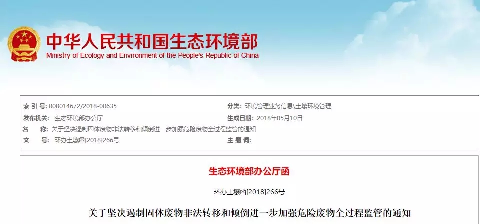 生態(tài)環(huán)境部日前印發(fā)了《關于堅決遏制固體廢物非法轉(zhuǎn)移和傾倒 進一步加強危險廢物全過程監(jiān)管的通知》(環(huán)辦土壤函〔2018〕266號,以下簡稱《通知》)。