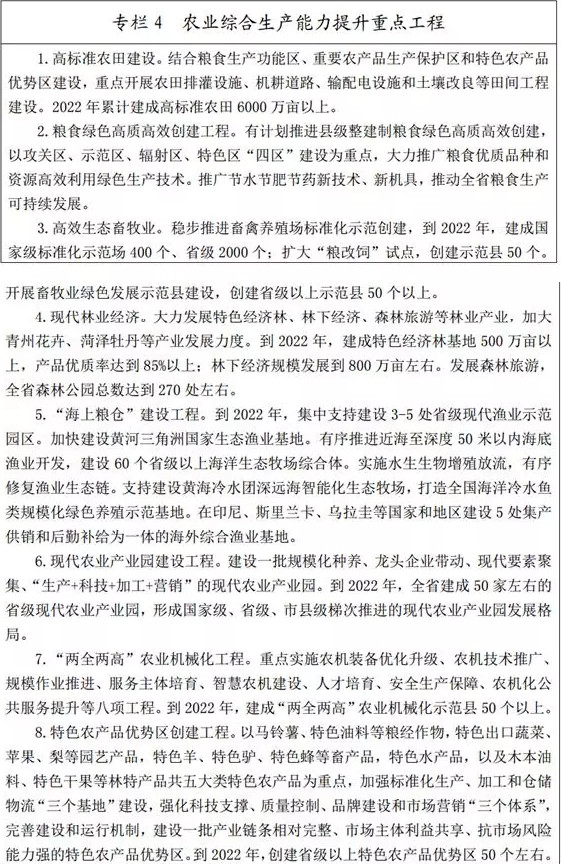 (三)提高農(nóng)業(yè)水利化機械化水平。大力實施農(nóng)田水利工程,推進大中型灌區(qū)續(xù)建配套與節(jié)水改造,因地制宜興建、提升中小型農(nóng)田水利設施,打通農(nóng)田水利“最后一公里”,加快建設現(xiàn)代農(nóng)田灌排體系。發(fā)展節(jié)水農(nóng)業(yè)、旱作農(nóng)業(yè),加快推廣水肥一體化,加大地下水超采區(qū)綜合整治力度。2022年基本完成35處大型灌區(qū)和一批重點中小型灌區(qū)續(xù)建配套節(jié)水改造任務,農(nóng)業(yè)灌溉水有效利用系數(shù)達到0.646,有效灌溉面積達到8000萬畝。圍繞推進“全程、全面、高質(zhì)、高效”農(nóng)業(yè)機械化,調(diào)整優(yōu)化農(nóng)機裝備結(jié)構布局,優(yōu)先發(fā)展大馬力、高性能、復式作業(yè)機械,大力發(fā)展智能化、高端農(nóng)機裝備。促進農(nóng)機農(nóng)藝融合,提高農(nóng)機裝備智能決策和精準作業(yè)能力,推進糧食機械化干燥,示范推廣棉花機采、花生機播機收等關鍵環(huán)節(jié)技術,推動糧棉油等主要農(nóng)作物生產(chǎn)全程機械化。加快推廣林牧漁生產(chǎn)、病蟲害防治、節(jié)水灌溉和農(nóng)產(chǎn)品初加工機械化。2022年農(nóng)作物耕種收綜合機械化率達到88%。